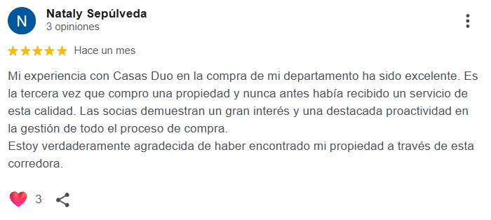 Mi experiencia con Casas Duo en la compra de mi departamento ha sido excelente. Es la tercera vez que compro una propiedad y nunca antes había recibido un servicio de esta calidad. Las socias demuestran un gran interés y una destacada proactividad en la gestión de todo el proceso de compra.