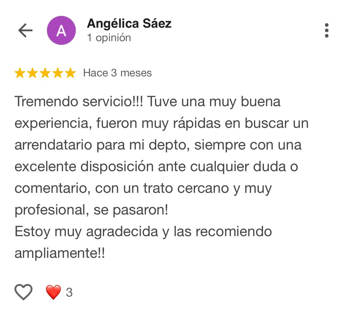 Tremendo servicio!!! Tuve una muy buena experiencia, fueron muy rápidas en buscar un arrendatario para mi depto, siempre con una excelente disposición ante cualquier duda o comentario, con un trato cercano y muy profesional, se pasaron!